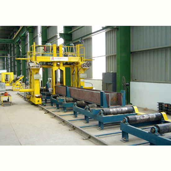 本機(jī)用于U型及箱型柱組裝,板材放在帶有輔助對中裝置的支架上,電機(jī)驅(qū)動行走門架,上、側(cè)壓缸壓緊工件的腹板和翼板組裝成型并點(diǎn)焊。