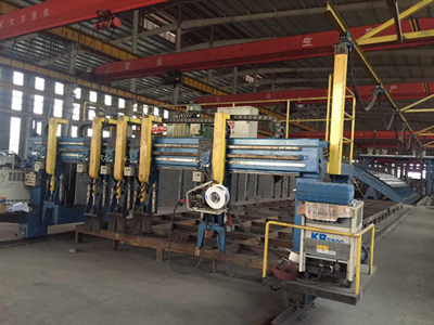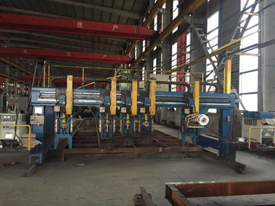 面板放置在工作平臺上并緊靠工作臺的定位裝置就位,U肋板按照面板上預(yù)先劃好的線進(jìn)行分段壓緊點焊完成工件的組裝。由液壓或手動螺桿壓緊兩種可選。